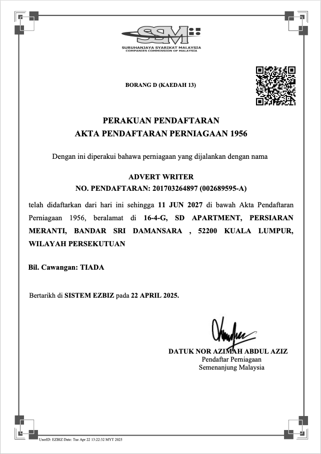 Advert Writer is registered with the Companies Commission of Malaysia (CCM) / Suruhanjaya Syarikat Malaysia (SSM) since 14 August 2017.